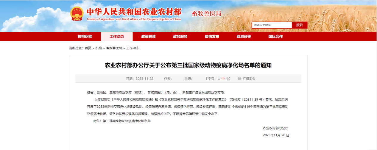 11月20日,农业农村部办公厅发布第三批国家级动物疫病净化场名单(农办牧﹝2023﹞29号),我司经部级专家评审,被评为国家级羊布鲁氏菌病(非免疫)净化场。