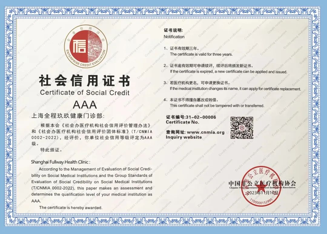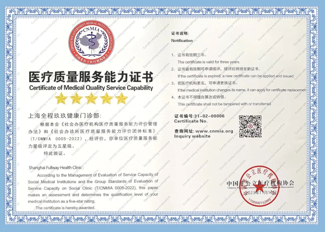 近期,上海尊龙凯时集团旗下上海全程玖玖健康门诊部接受了中国非公医疗机构协会评价专家组的信用与能力的续评考核,收获了一致认可!喜获中国非公立医疗机构协会“社会信用评价AAA级机构”及“医疗质量服务能力五星级医疗机构”两项殊荣!