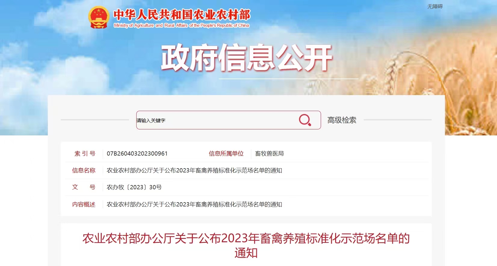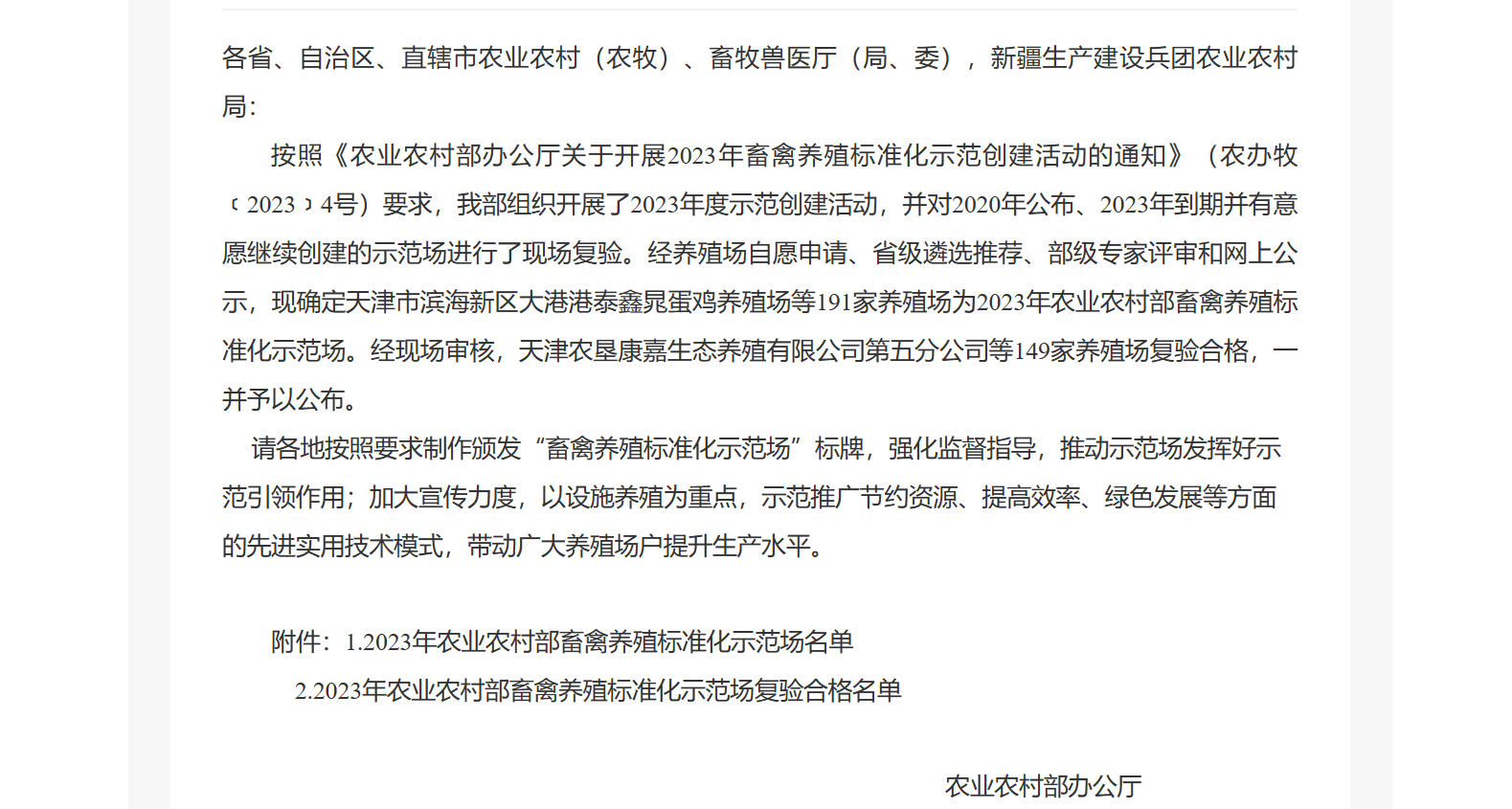 近日,农业农村部办公厅公布了2023年全国191个畜禽养殖标准化示范场名单,尊龙凯时集团旗下鹏睿农牧中陈核心育种场正式获批部级畜禽养殖标准化示范场。