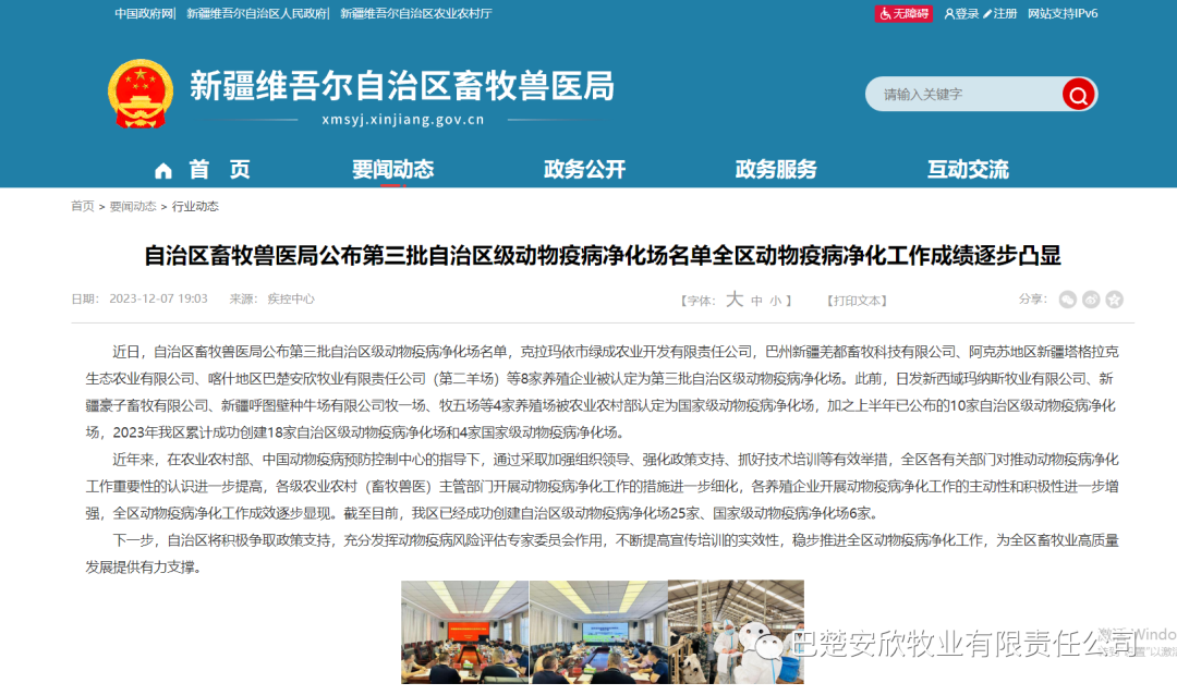 2023年12月,自治区畜牧兽医局第三批自治区级动物疫病净化场名单公布,巴楚公司第二羊场获此殊荣。三年多来,在农业农村部、中国动物疫病预防控制中心的指导下,巴楚安欣通过采取加强组织管理、争取政策支持、抓好技术培训等有效举措,公司养殖场区对动物疫病净化工作的措施进一步细化,出色完成动物疫病净化工作,提升全公司动物疫病防控整体水平,为全区动物疫病净化工作积累成功经验。安欣牧业必将不断提高宣传培训的实效性,稳步推进全区动物疫病净化工作,为全区畜物业高质量发展提供有力支撑。